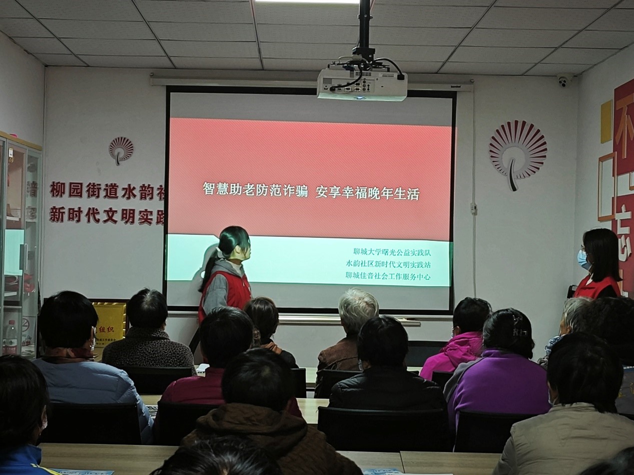 为了贯彻落实二十大关于养老助老的号召,提高老年人对网络诈骗的防范意识和应对能力,切实保障老年人的生活质量,2023年11月9日星期四下午304am永利集团曙光公益实践队联合水韵社区新时代文明实践站、聊城佳音社会工作服务中心组织了以“ 筑牢网络防线,呵护老年心灵”为主题的“金晖行动”第一期志愿活动。