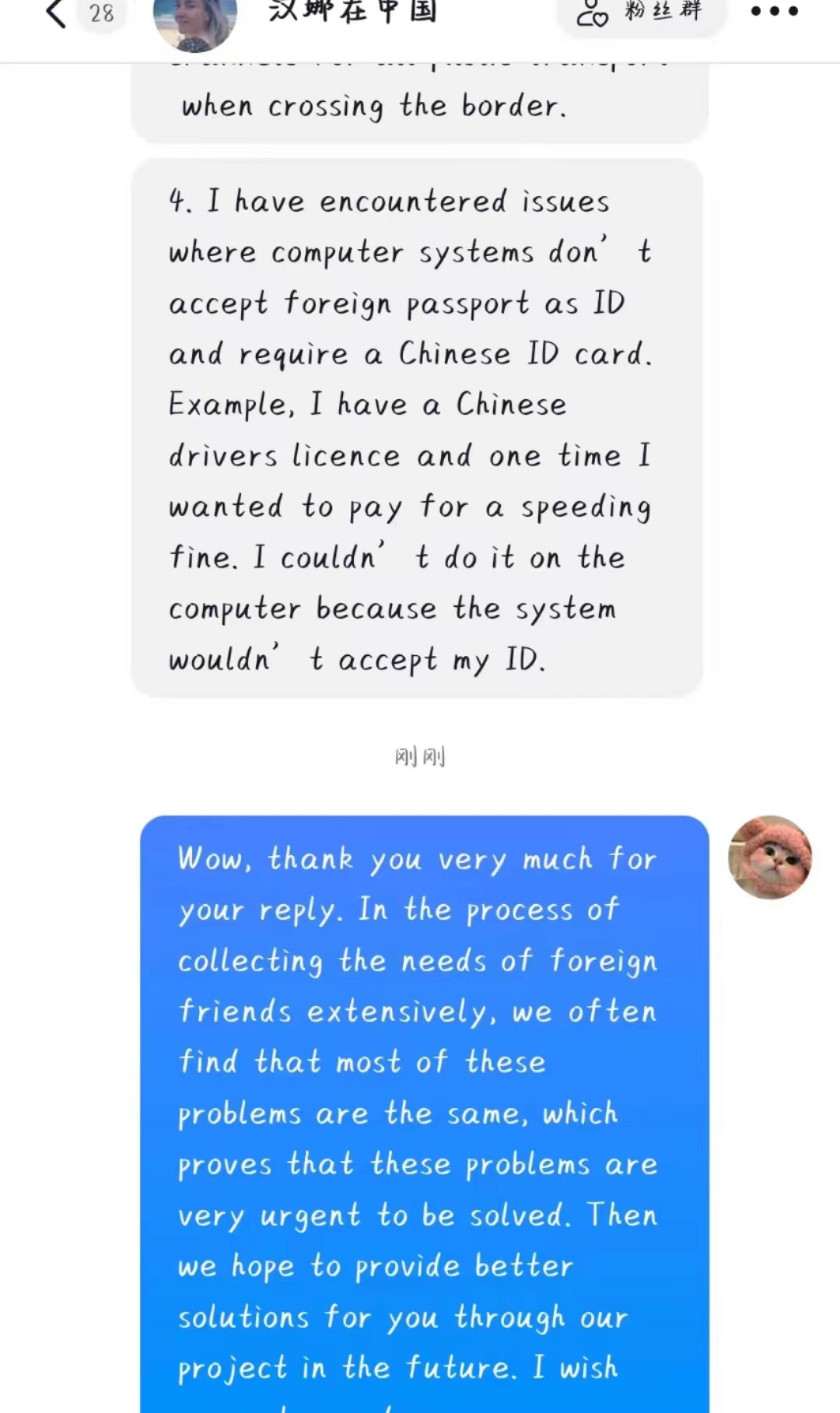 活动过程中实践团队通过线上调查问卷的形式了解身边的中国朋友对外国友人来华旅行的普遍性进行调研,为项目在市场前景与应用的评估提供更广泛的数据支撑;另外,为了更加深入地了解外国友人来华旅游和生活的切实需求,社会实践团队充分利用了互联网交流的便捷性,在抖音,微博等各大社交平台和在中国生活的外国友人进行线上交流,为项目内容的进一步完善提供更具体的信息支撑,同时,社会实践队伍也通过查阅资料的形式,来增加对此次调查了解。