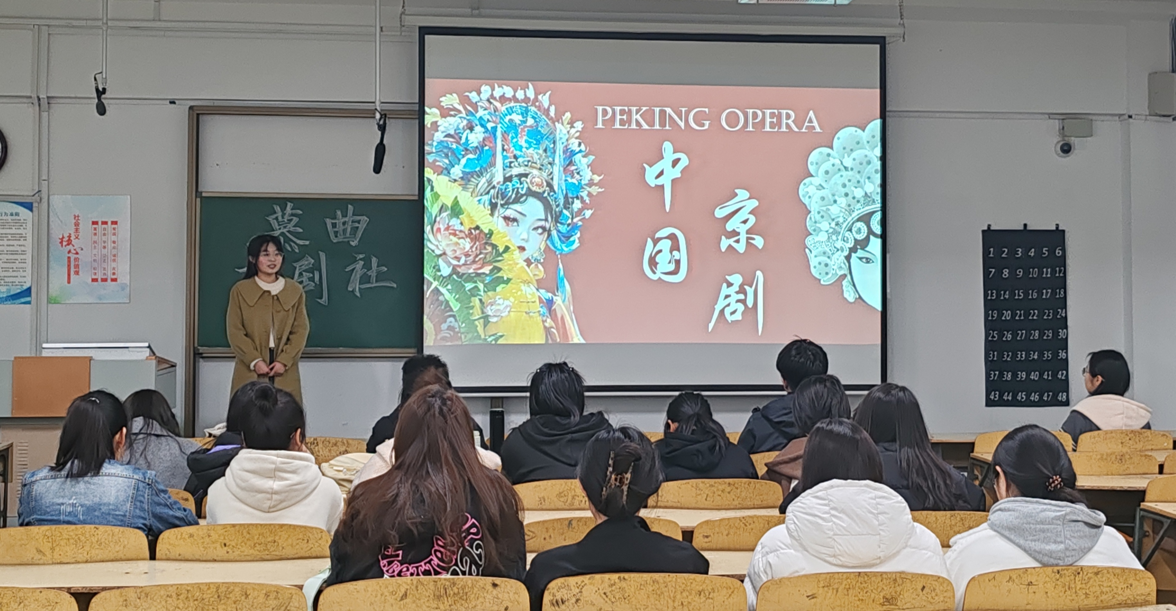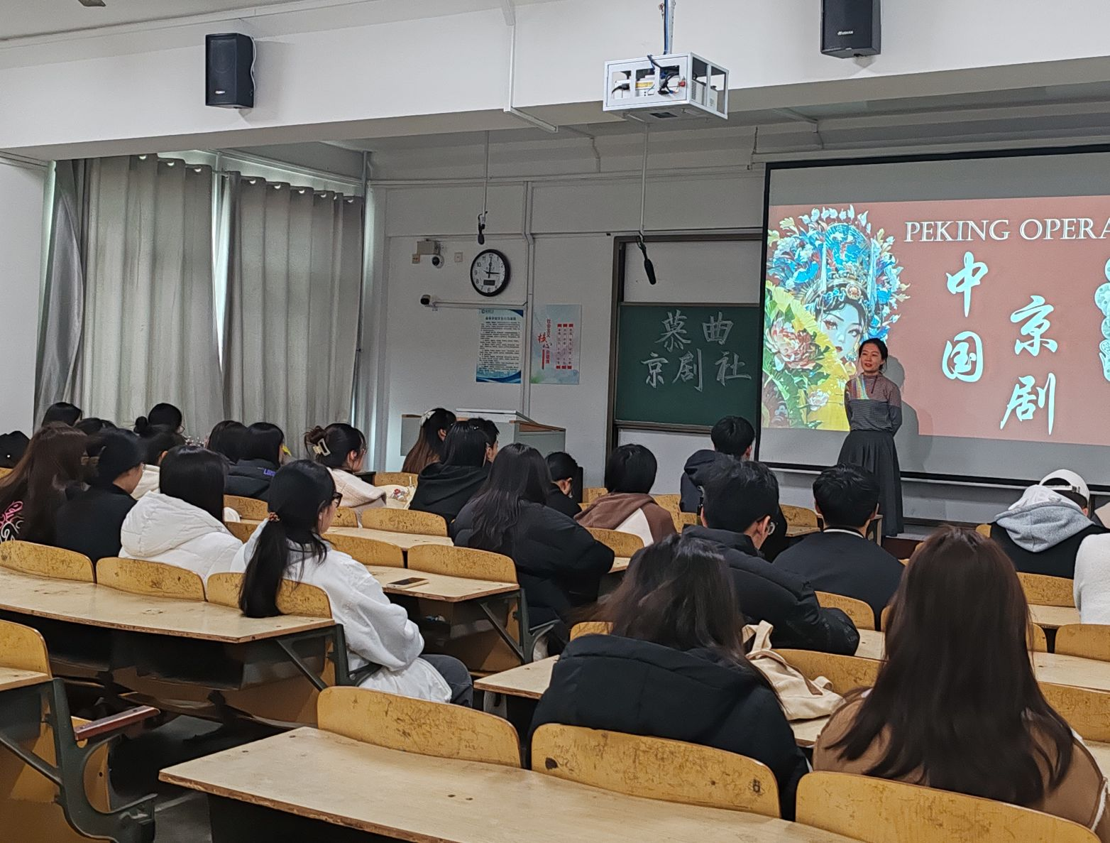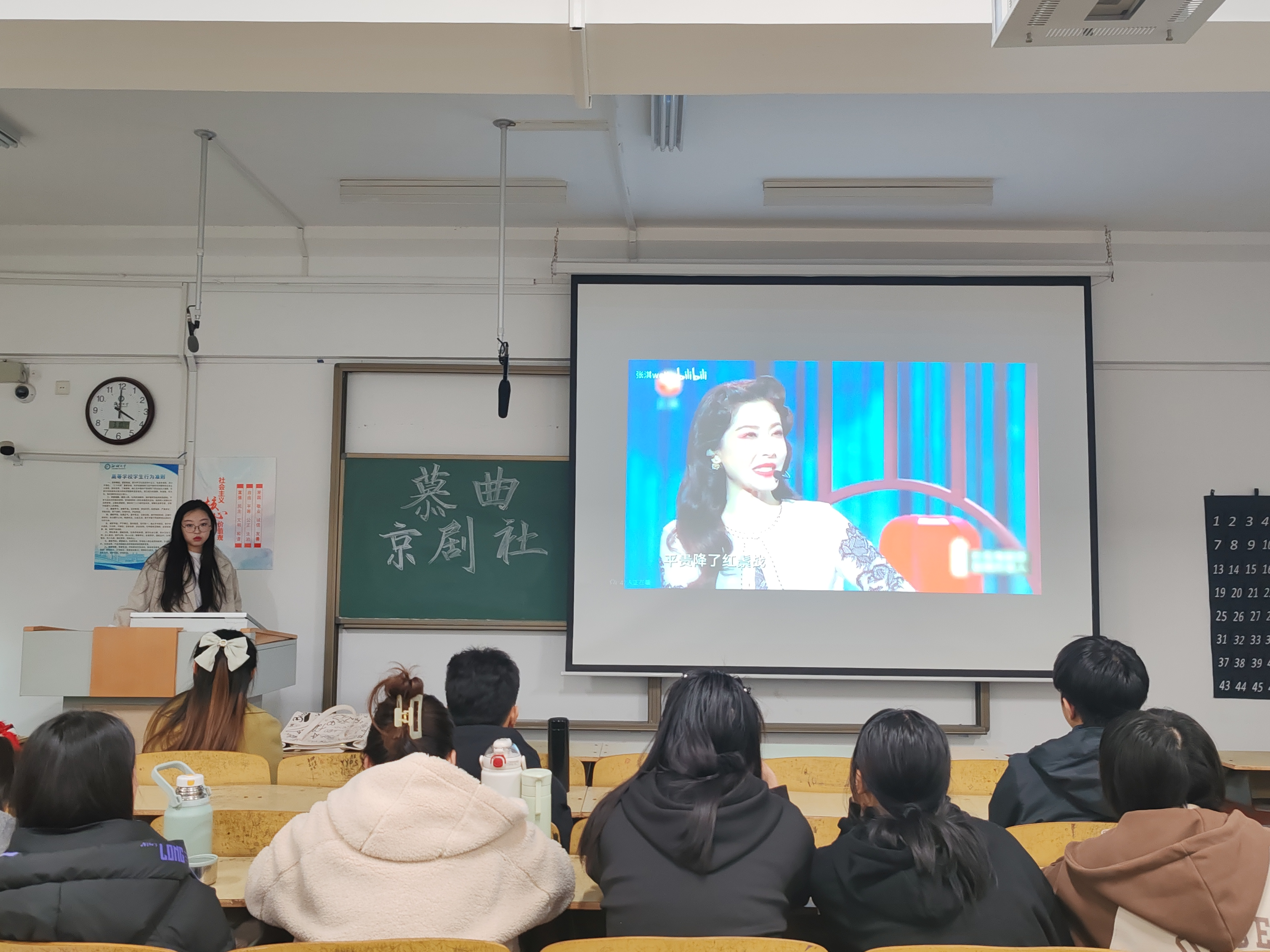 梨花羞落,婉语莺声。随后,社团理事长于梦通过宣传短片与细致的讲解,为同学们详细介绍了京剧的起源、表现形式、主要特点以及流派等方面的知识。短片中,穆桂英一句“猛听得金鼓响画角声震”,仿佛将所有人都拉入了那金戈铁马的时代,两段视频播放完,观众们还深深陶醉在京剧铿锵唱段的魅力中。