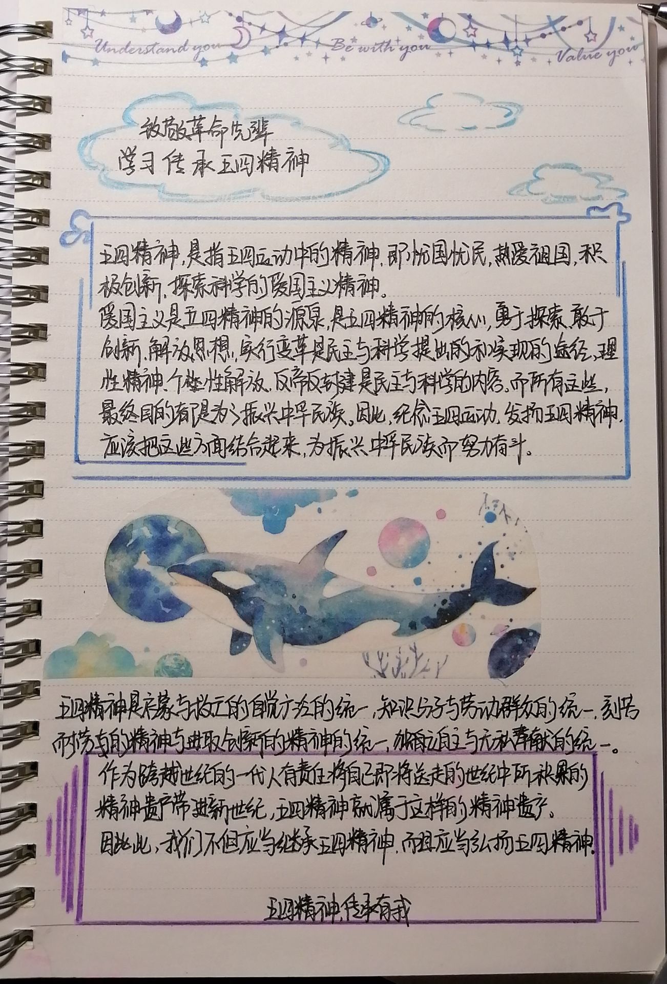 大风起兮云飞扬,大国兴兮梦青春!五四精神激励了一代又一代的青年人,本次活动通过线上的方式征集作品,收集到了许多来自同学们的“传承五四精神”的剪辑,热血青年就应奋发向上,同学们在短视频中用不同的方式,在各自的家乡传承、发扬五四青年精神,绽放青春力量!作为当代青年老员工,我们还善于运用笔墨水彩来描绘我们心中的五四精神,同学们将自己心中的五四精神绘制成手帐和手抄报,展示出我们时代青年的模样,还有同学观看了电影《建国大业》,并将感悟以文稿的形式展现给大家,激起同学们的爱国情怀。一幅幅精美的手帐,传递着我们的五四青年精神,一篇篇励志的文章,传达着我们青年的责任与担当。作为青年人的我们,要继承好革命先辈的优秀精神,发扬新时代的爱国精神,增强自身的责任感和使命感,为祖国的发展贡献力量。
