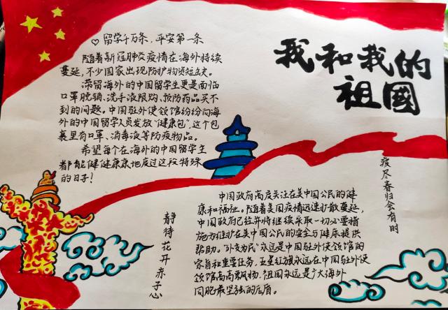 青山一道同风雨,明月何曾是两乡。本次线上活动通过作品评选的比赛方式表达我们对“祖国母亲向海外职工发放健康包”这一举动的支持。通过征稿,我们收集到了271位同学发来的文稿和手绘画、书法作品等等,每份作品都包含着他们对祖国母亲的爱,每份作品都显示出了他们为有一个强大的祖国而骄傲。通过层层筛选,最终,19级11班黄恋舒的作品“祖国是我们最坚强的后盾”因文藻优美,感情真挚被评选为一等奖,她在文稿中写道“疫情可以隔开人与人之间的物理距离,但隔不开血浓于水的同胞亲情,隔不开患难与共的家国情怀。无论何时何地,祖国永远是我们最坚强的后盾”。她用最朴实的话语表达出了“即使相隔万里,我们依然爱你”的家国情怀。
