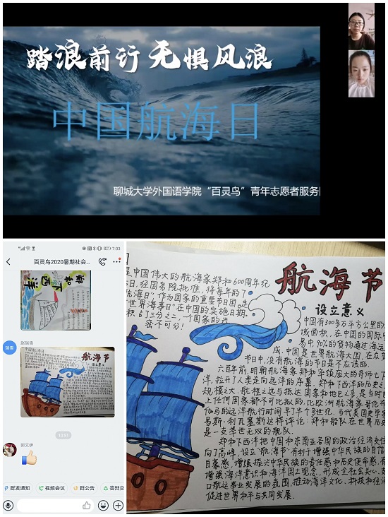 由于疫情的原因,同学们通过钉钉视频会议的形式,于线上录制宣讲视频,向社区人民讲解有关航海日的知识,从而达到弘扬民族精神的目的。活动过程中,王莹洁同学通过PPT的形式向人们介绍了中国航海日的由来、背景、节日标志以及内容和意义,增进了社区人们对航海日的了解;紧接着赵瑞雪同学通过展示和讲解本次活动的优秀手抄报,采用图文结合的形式为人们生动地讲述了郑和下西洋的历史故事,同时,通过线上问答的方式使同学们对中国航海日设立的意义有了更深刻的认识。最后孙倩同学利用诙谐幽默的语言为社区人民讲述了一系列航海小故事,并通过讲解我国航海事业的现状以及航海外交事务,带领人们进一步了解了中国的航海事业。