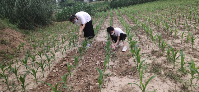 活动初期,同学们选择了难度相对较小的拔草。劳动一段时间后同学们发现,在玉米地中徒手拔草非常费劲,于是便请教了同时在农田里劳作的农民大妈。在农民大妈的帮助下,同学们从一些农户家里借到了锄头和镢头,并且在农民大妈的指导下学会了如何使用这些锄具在农田里除草。农民大妈还告诉同学们,这样做不仅可以除草还可以为作物松土,有助于它们的生长。拔完草后,同学们又前往了棉花田。由于此时的棉花苗还未长出,同学们便跟着农户们学习如何给棉花苗去顶、打叉等。相对于在农田中拔草而言,棉花田中的劳作虽然不用花太大力气但需要更精细更专注的要求。在此过程中,同学们虽然感到劳累、辛苦,但在看到自己的劳动成果后却是收获感满满,幸福与自豪油然而生。