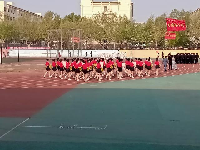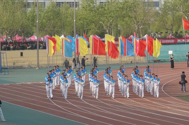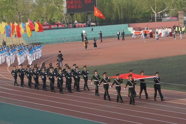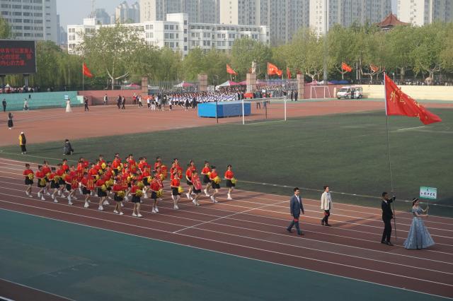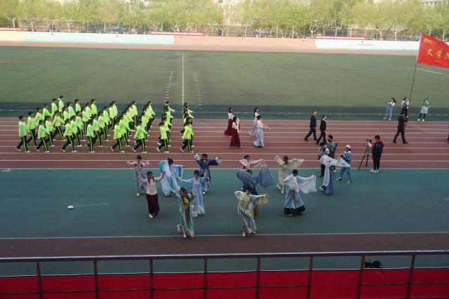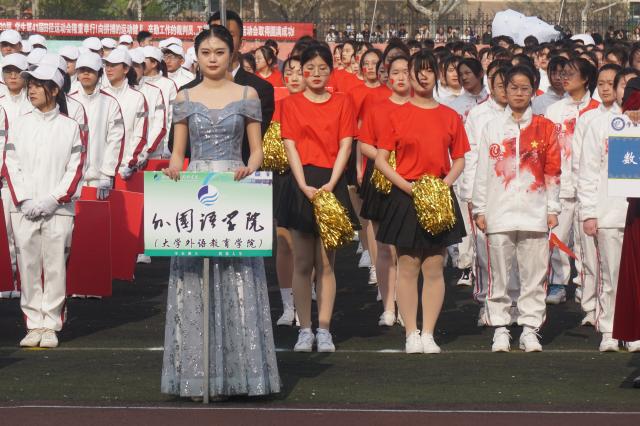 由员工组成的方队依次入场,他们步伐齐整,以沉健有力、朝气蓬勃的姿态走过主席台,乾坤可揽,日月可旋,少年之行,未来可期。八时整,伴着熟悉的“运动员进行曲”旋律的响起,国旗和运动会会旗在仪仗队护卫下率先入场,鲜花方阵队、彩旗方阵队及员工代表队也脚步稳健地步入运动场。运动员们昂扬的斗志、饱满的状态、勃发的英姿唤起了观众们的热情,掌声、欢呼声不绝于耳,在校园上空回响。文学院仪仗队成员身着汉服,在春日暖阳下翩翩起舞,赢得观众阵阵掌声,展现出华夏大地的人杰地灵与深厚的文化内涵。体育学院在观众的注目中,红、黄、紫六头舞狮随着鼓点的轻重缓急,彼此或交织争斗,或跳跃翻转。将中国传统艺术表现得淋漓尽致。304am永利集团手举标语牌“会通中外,信达天下”,斗志昂扬地向主席台走来,将“学好外国语,做好中国人”的理念表现得淋漓尽致。