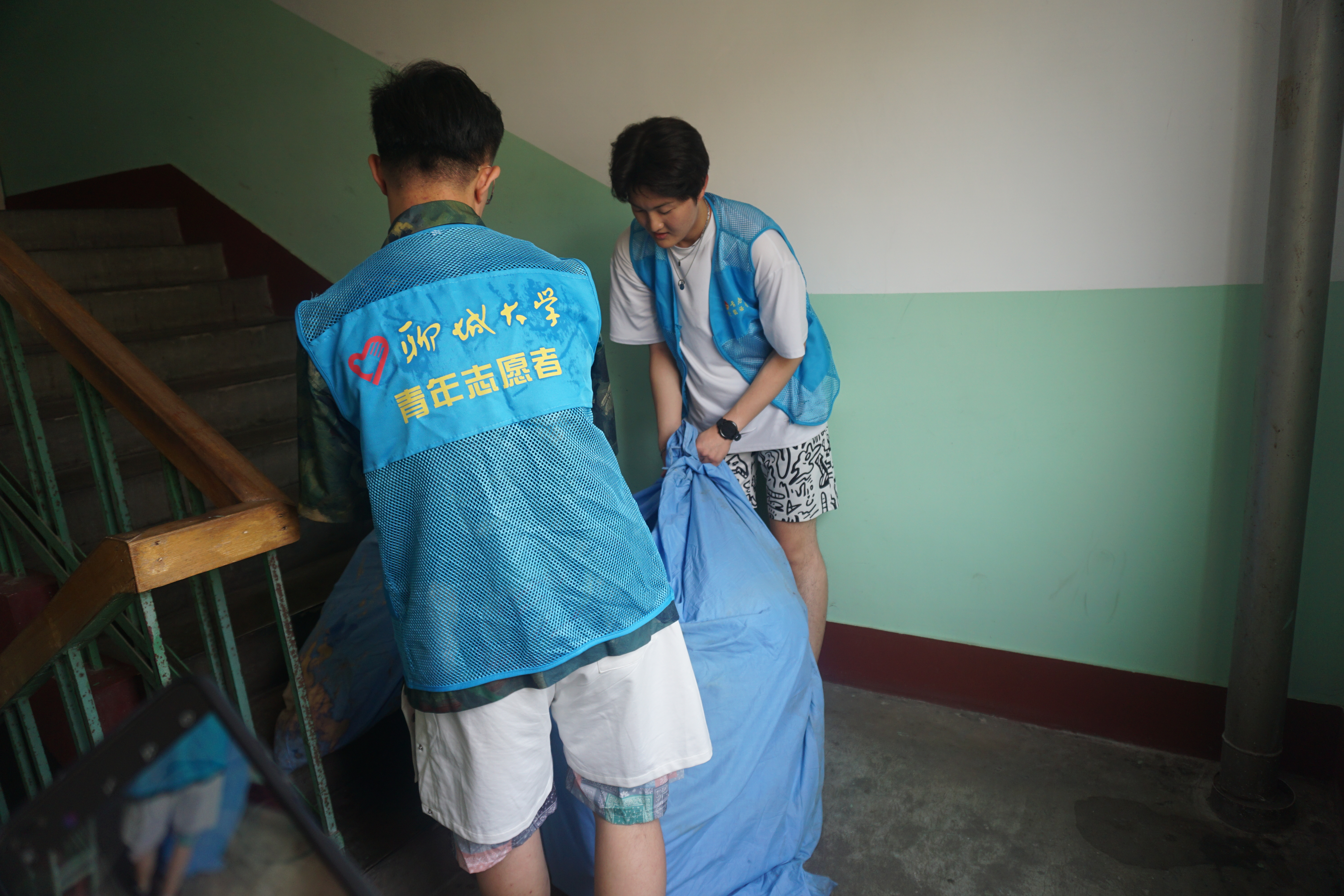 毕业生离校期间,志愿者们坚守岗位,在学苑三门口设置志愿服务点,为毕业生提供便利,解答疑惑,同时提供整理宿舍内务、搬运行李、运送垃圾等一系列服务。毕业生寝室所在楼层较高,搬运行李较为不便,志愿者们便化身“最美搬运工”,开展“多对一”服务,汗流浃背从毕业生所在的五楼、六楼搬运行李下楼十几趟,并将行李统一放置在一楼大厅摆放好。志愿者们从不抱怨,齐心协力认真完成任务,一遍又一遍的往返于一楼与六楼之间,发扬了老员工不怕苦、不怕累、无私奉献的志愿精神。虽然天气炎热,志愿者们的衣服都被汗水浸湿,但他们热情不减,依然笑容灿烂,脸上满是帮助他人的喜悦与自豪。随着志愿服务活动的有序进行,越来越多的毕业生主动前来寻求帮助并表示感谢,现场洋溢着和谐、友善的氛围。