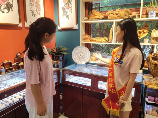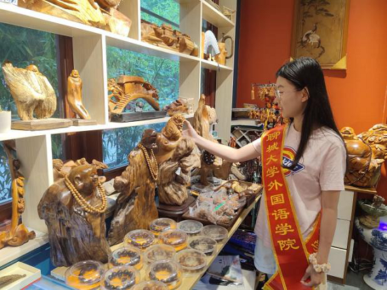 同学们走进古城,在讲解员的带领下欣赏精致的木雕展品,参观木制、竹制旅游纪念品区及聊城特色木雕工艺品区等木雕展区。从历史背景到文化内涵,讲解员由浅入深地讲述木雕背后的故事,展示其深刻的内涵,一件件“沉睡”的木雕工艺品仿佛被重新注入了活力。讲解员说道,“传神是人像木雕的最高境界”,她带领同学们近距离参观木雕佛像,其面部表情栩栩如生,刻画出了佛的庄严沉静,展现出艺术家“人刀合一”的高超技艺。参观过程中,队员们通过微信小程序等平台,进一步了解了起源、发展过程等木雕文化的详细内容。同学们被精工细作的建筑装饰、家具摆设、佛像佛具深深吸引,深刻感悟到木雕的魅力,沉醉于中国文化的源远流长、博大精深。同时,同学们购置了几件木雕文创产品,尽自己的力量推动木雕技艺的传承。