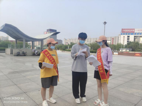 实践队队员们于网上认真搜集了相关资料,根据中国共产党的百年历史进程制作出了一份详细的调查问卷。服务队队员们戴好口罩,做好防护措施,来到聊城市人民广场邀请在场市民填写调查问卷。填写完毕后,队员们结合调查问卷的结果向市民们提出采访请求。市民们表示,中国共产党成立的100周年是中国人民从站起来到强起来的100周年,这100年里,无数共产党人矢志不渝、艰苦奋斗,为把中国建设成为社会主义现代化强国不懈努力,他们的精神和事迹值得所有人学习。在本次活动中,同学们向居民们重点讲解了中国共产党的百年历史大事件,并详细阐述了中国共产党百年来取得的伟大成就。受采访的市民朋友表示,宣传党史是一件非常有意义的活动,只有“不忘初心、牢记使命”,中国才能创造出更加辉煌的未来。