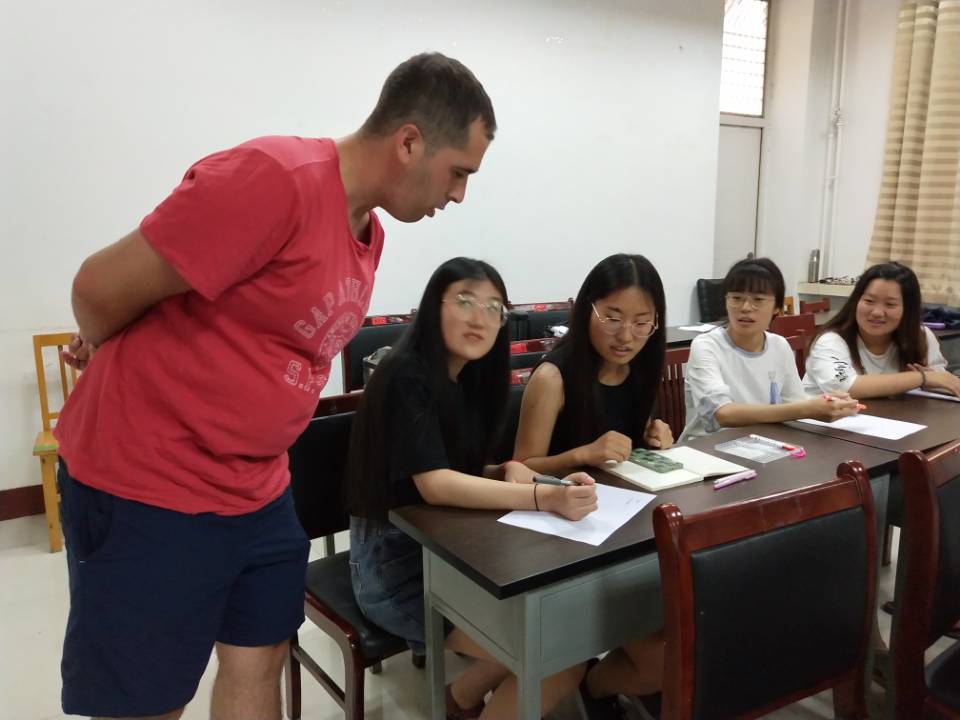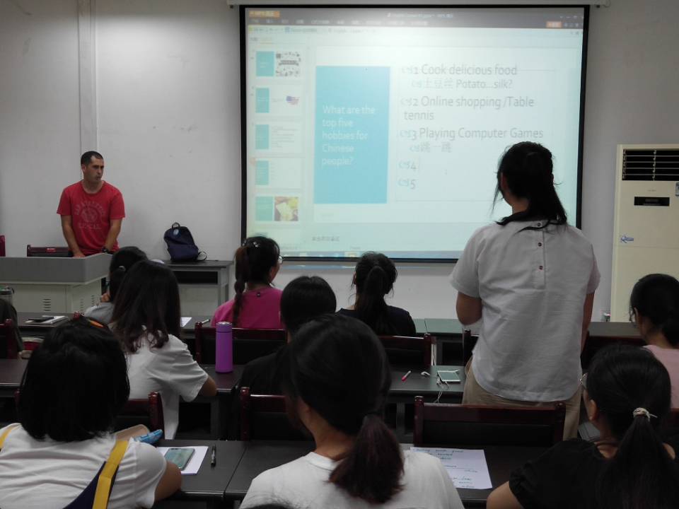 本次英语培训由外籍教师Benjamin Wood主讲,分为小组讨论与游戏互动两个环节。外教Benjamin Wood以幽默诙谐的语言向同学们进行了自我介绍,并抛出“What is your hobby?”的活动主题。同学们3-4人为一组,对“My hobby”进行了激烈的讨论。随后,每组推选一名代表进行了时长1分半的即兴演讲,同学们热情饱满,整个过程精彩纷呈。在接下来的“你演我猜”游戏环节中,一人比划一人猜,将刻板的单词和短语赋予了生命力,表演者既可以翩翩起舞,也可以有声有色,游戏生动有趣,台下的观众掌声连连,也都跃跃欲试。课堂上的每个环节都将外教和同学们紧密联系在了一起,教室里激情澎湃、欢声笑语,同学们都表示收获良多。