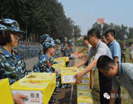 一个个笑脸,洋溢在脸上,一个个月饼,被捧在手心。在军训期间,学院领导老师们,深入连队,关心新生们的军训身心适应情况,并就即将到来的、同学们第一次没有家人陪伴的中秋佳节带来了温暖和感动——送月饼。同学们排列着整齐的方阵,老师亲手将一箱箱的月饼分发给同学,装载着祝福,满载着希望,新生们欢乐洋溢在脸上,感受着老师们带来的家人般的温暖。