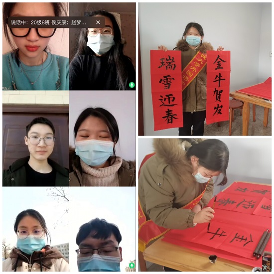 笔毫歌盛世,翰墨谱华章。毛笔书法是中国的民族文化瑰宝,其历史源远流长。权益部服务队成员们此次特地访问当地富有盛名的书法学者,聆听长辈对历史悠久的书法文化介绍,并在在了解毛笔文化的的基础上,临摹书写毛笔字画。通过学者的指导,同学们以对联为例,手执毛笔,一横一竖的在红色对联上写下了自己对新年的祝福与期盼,在书写中,同学们既学习到文房四宝的材质及书写姿势对于毛笔字书写的重要性又学习到每一笔画的三写过程、不同字体的书写区别等文化知识,在临摹中既感受到了古人书写每个字心情,又将自己的感情注入笔下,整个过程让人回味无穷。学习过后,每一位同学将自己的心得感悟通过线上的方式与成员之间分享,相互学习借鉴,交流不同字体的书写方式。