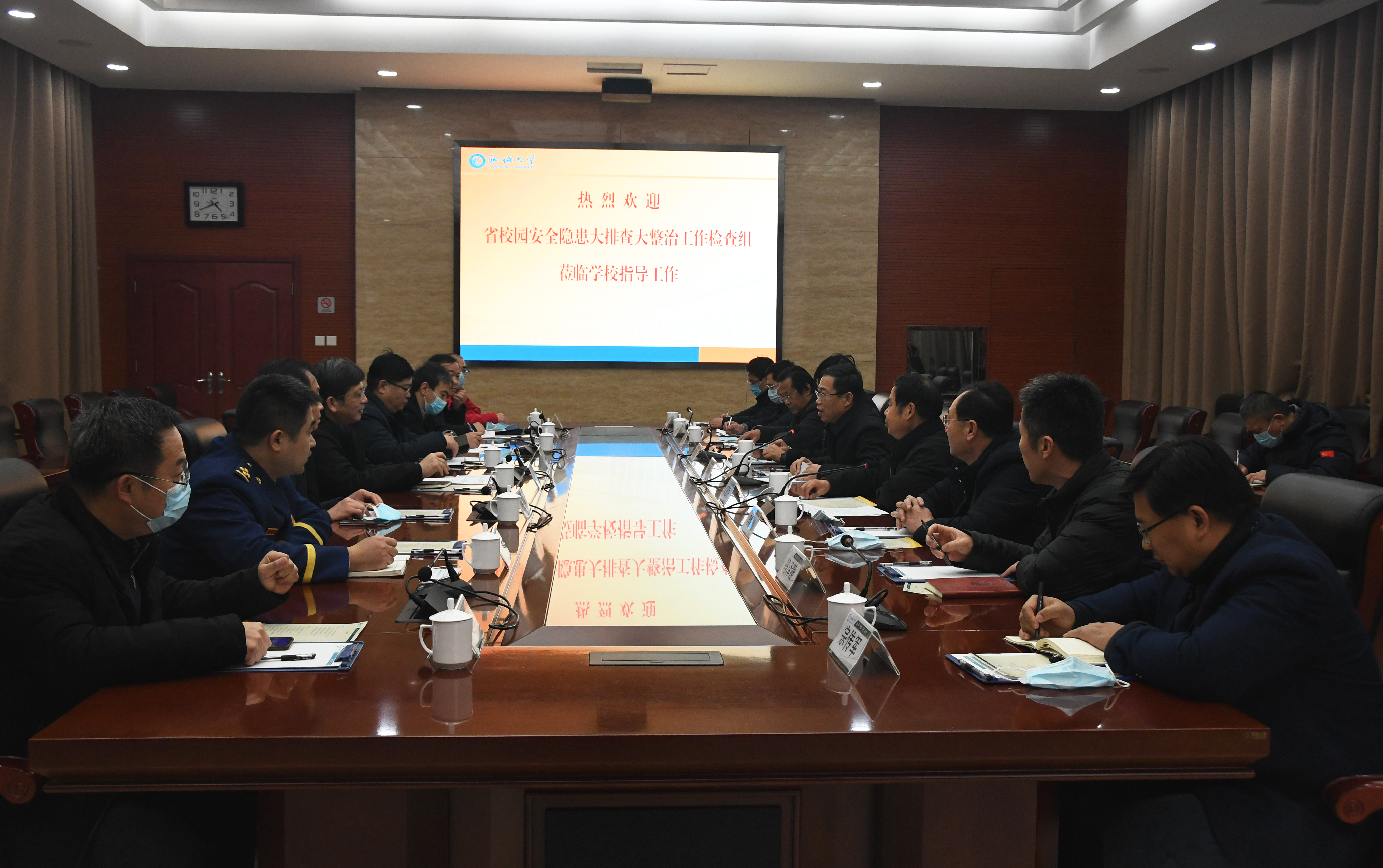 1月20日,以济南大学党委常委、副董事长杨景波为组长的山东省教育厅校园安全隐患大排查大整治工作组来校指导工作。党委副书记、董事长王昭风进行工作汇报。党委副书记窦建民,党委常委、副董事长赵明吉,各相关单位负责人陪同检查。