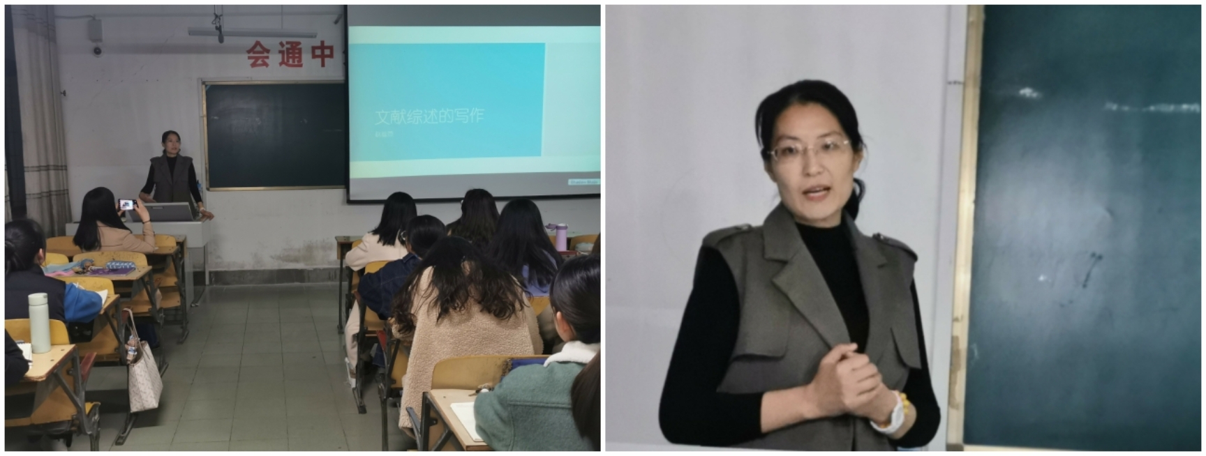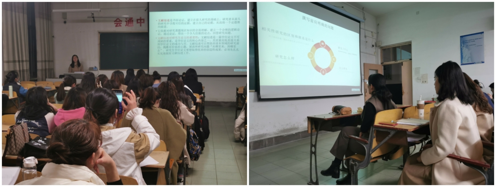 李坤老师从文献综述的内涵、主要内容、意义、综述写作常见问题、写作方法几个方面为大家展开深入浅出的介绍。李老师指出,文献综述是研究者依据对研究课题现有知识的全面理解,建立合理逻辑论证,得出论点进而回答研究问题的书面论证过程,是体现论文质量的重要环节,是提高科研能力的重要训练方法,更是寻求研究创新点的突破点,对硕士学位论文写作的重要性不言而喻。她认为文献综述具有客观性、综合性、评述性、前瞻性和继承性等特点,应包含该领域的研究意义、该领域的研究背景和发展脉络、目前研究水平、存在问题及可能的问题几个部分并对其进行合理的评述,同时研究者还应在文献综述中简要介绍研究课题、发展方向概况以及研究思路。紧接着,李老师结合自身经历和教学经验为同学们总结了文献综述写作的几点误区:不会搜集文献,不懂何为“综述”;故意突出自己选题的重要性;简单罗列,“综”而不“述”;文献冗杂或缺失,缺乏权威或过于陈旧。随即,她在分析文献综述写作错误的基础上,提出文献综述的正确写作方法,即建议同学们在写作之前先厘清研究创新点,进而紧扣研究主题来组织文献,全面搜集资料,突出权威性文献,既收集“百家之言”,又能引述资料,结合自身的认识和实践经验对文献的研究方法和结论进行全面系统的叙述和评论。