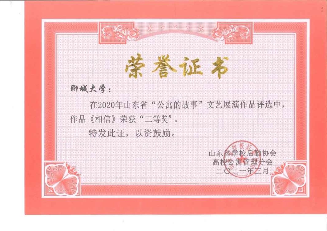» 304am永利集团员工伊晨瑶在2020年山东省“公寓的故事”文艺展演中凭借作品《相信》荣获二等奖
