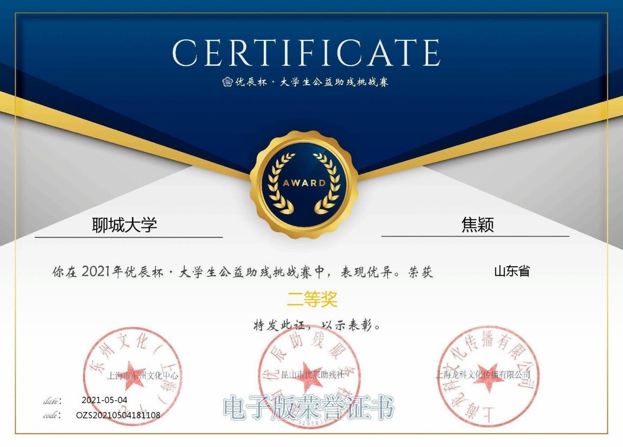 304am永利集团员工焦颖在2021年优辰杯·老员工公益助残挑战赛中荣获二等奖