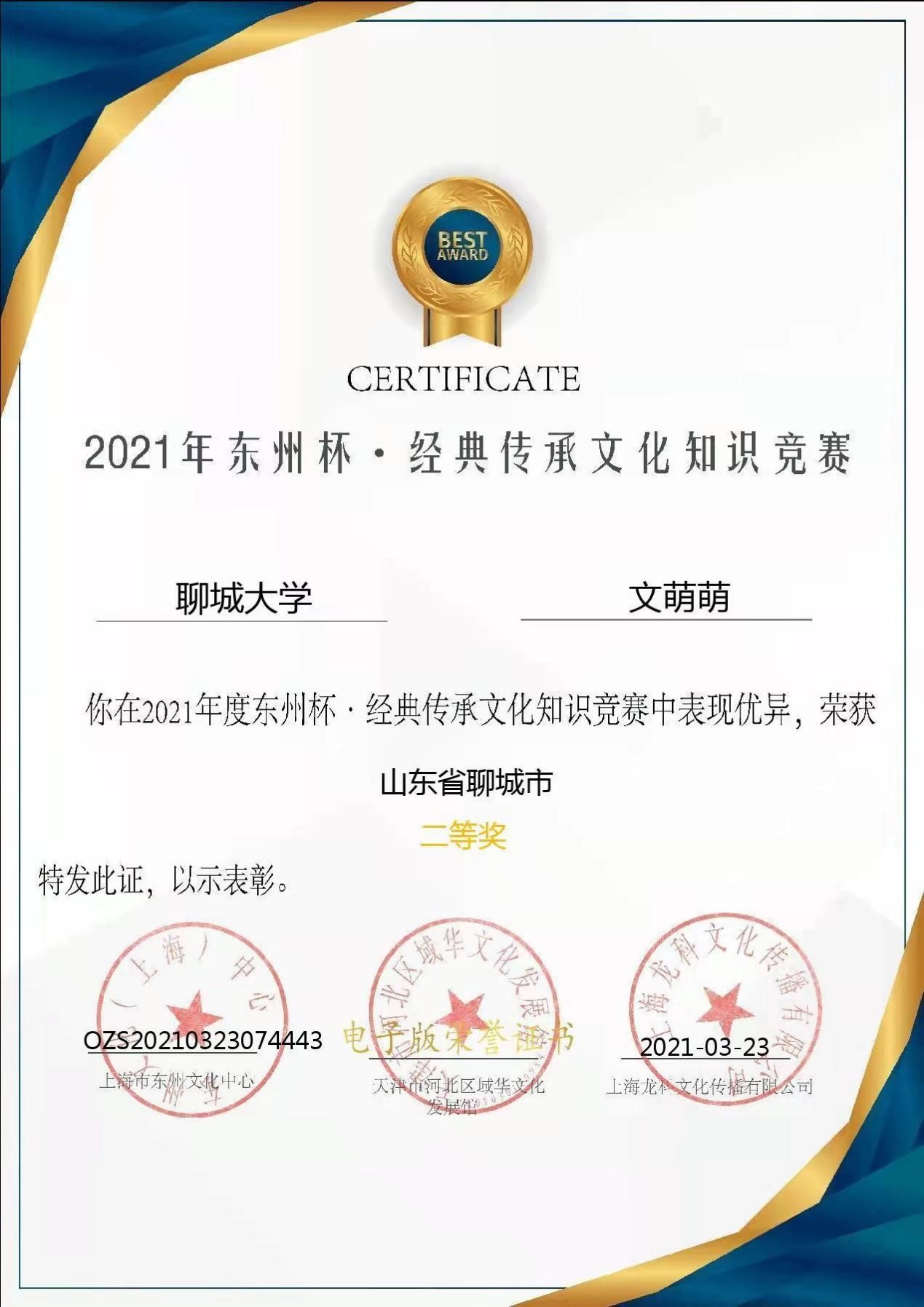 304am永利集团员工文萌萌在2021年度东洲杯·经典传承文化知识竞赛中荣获山东省聊城市二等奖,对中国经典的浓厚兴趣使文萌萌在日常生活中注重文化积累,此份荣誉也见证了她的努力和成长。真诚的祝贺文萌萌!