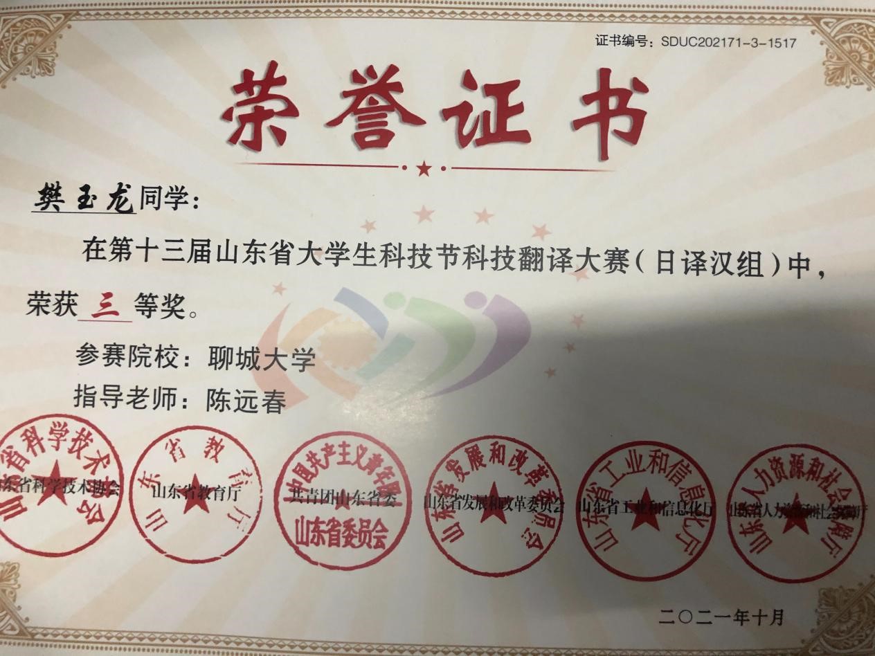 304am永利集团员工樊玉龙在第十三届山东省老员工科技节科技翻译大赛(日译汉组)中荣获三等奖,在日常的学习生活中,樊玉龙踏实做事,不浮躁,有耐心,该份荣誉是对其平时努力的最大肯定。在此,樊玉龙同学致以最真诚的祝贺。
