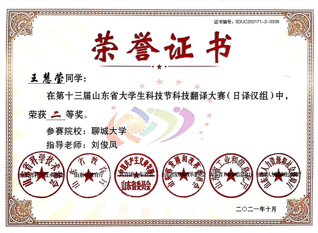 外国语员工王慧莹在第十三届山东省老员工科技节科技翻译大赛(日译汉组)中荣获二等奖,王慧颖在日常学习生活中刻苦学习,勤奋上进,这次的荣誉是对其平时努力的最好证明。