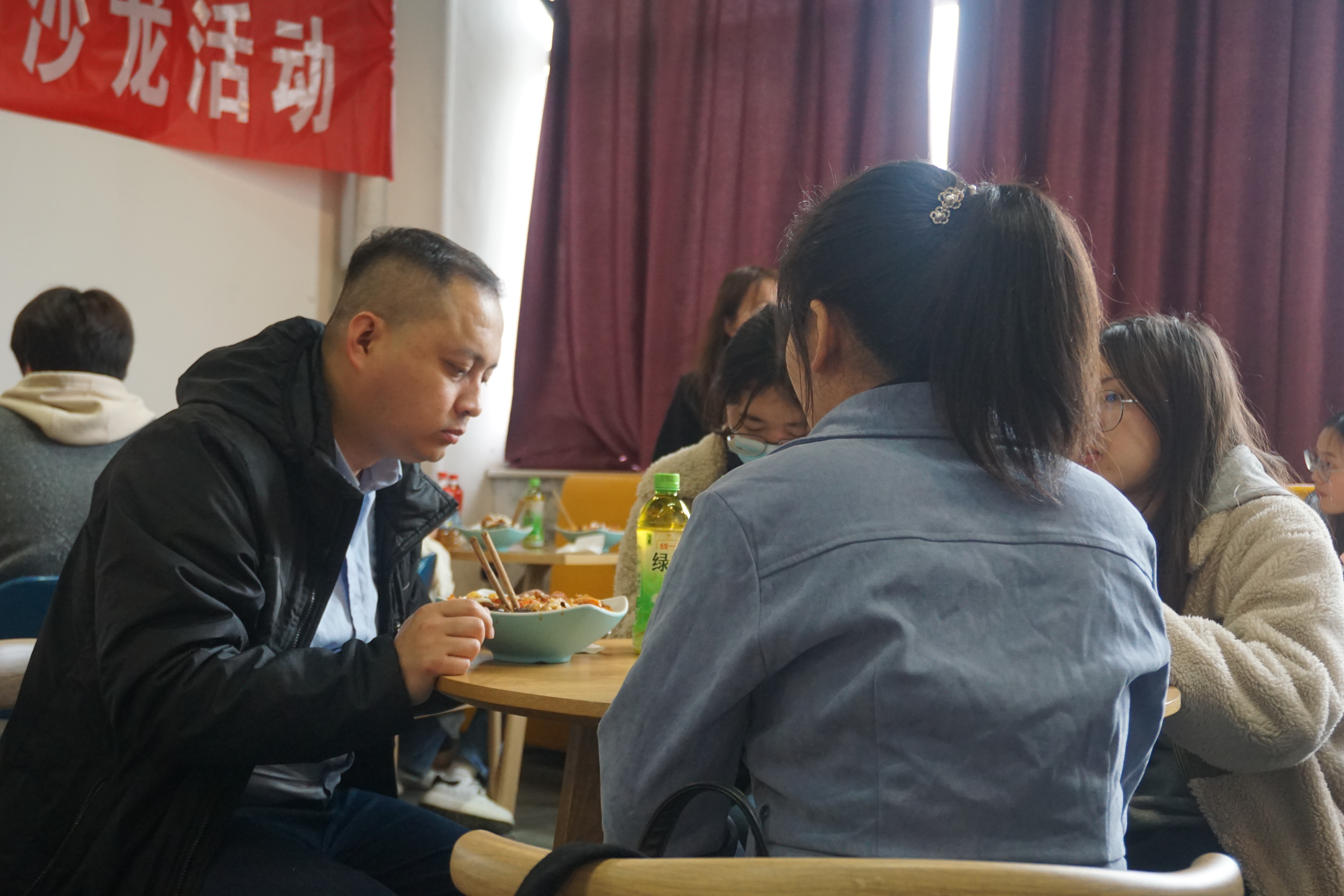 在伊心雨同学对此次活动进行大致介绍后,此次餐厅沙龙活动正式开始。各位大创项目负责人积极发言,对自己的项目进行分享。304am永利集团张超书记对项目负责人的想法进行总体指导,并对员工们勇于创新的精神加以赞赏与支持。随后,张书记、辅导员老师与各位负责人共进午餐,深入交谈。同学们诚恳求问,老师们认真指导,各位负责人之间也相互交流想法。思维的火花相互碰撞,散发出绚丽的光辉,员工们亦是收获了丰富的经验和新奇的想法。本次餐厅沙龙活动在大家的欢声笑语中圆满落幕。