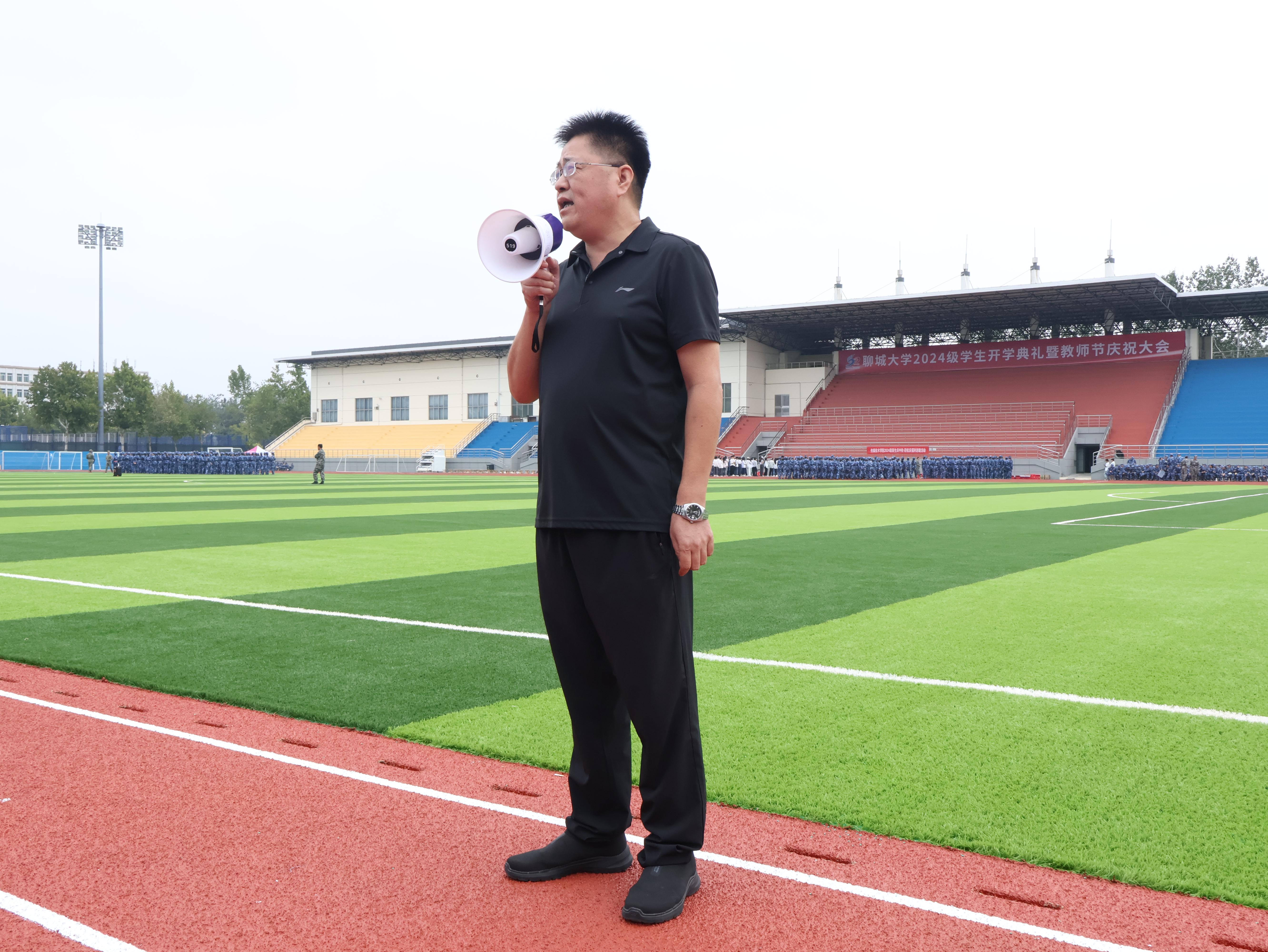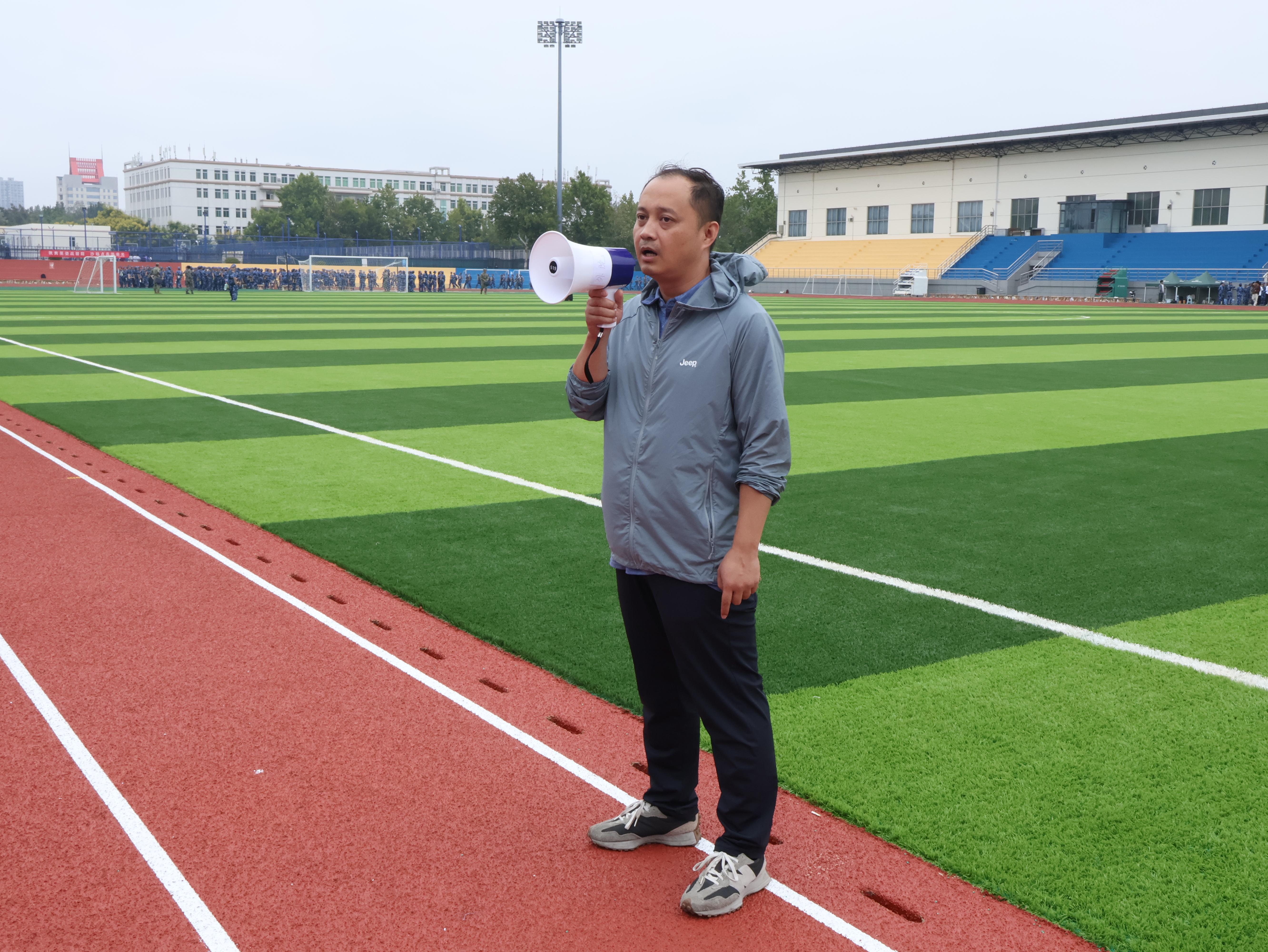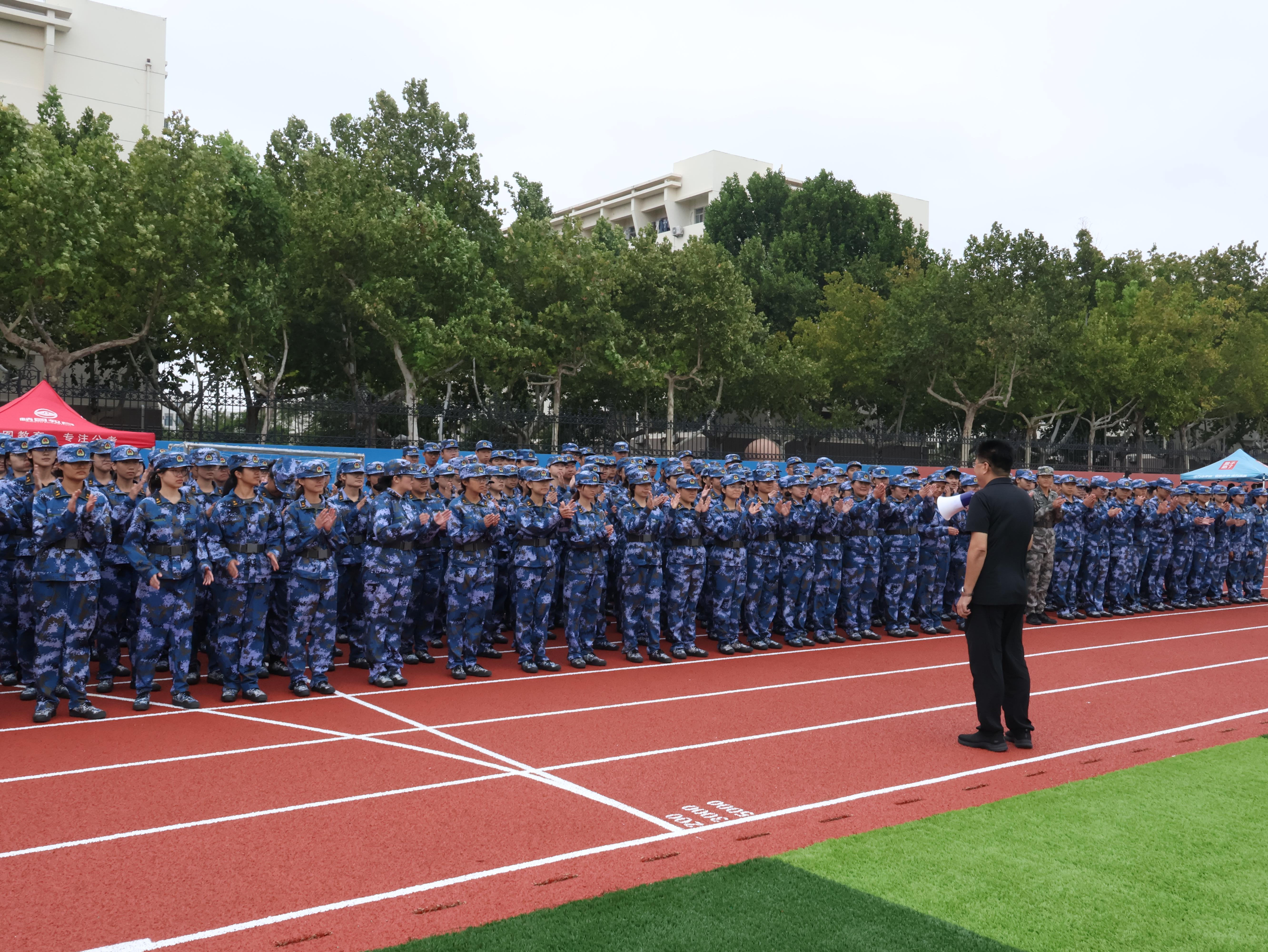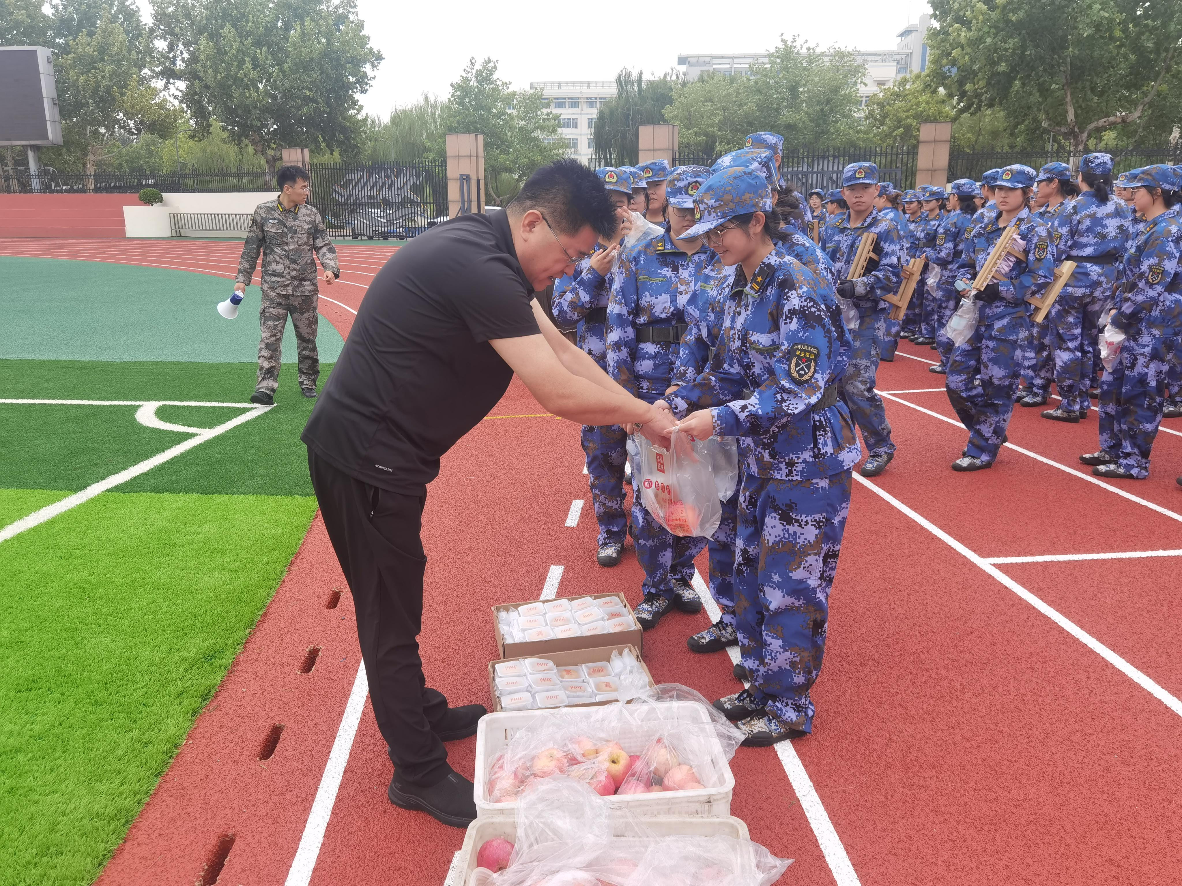 在操场上,军训连队迅速集结,队伍整齐有序,展现出昂扬向上的精神风貌。王洪月书记向全体新生致以了中秋节快乐的美好祝愿。同时,他高度赞扬了新生们在军训中展现出的不畏艰辛、不懈努力的精神,对新生表现出的坚韧与毅力给予了充分肯定。接着,王书记向新生们提出了新的期望,希望各位新生持续保持这种积极进取的态度,勤奋学习,为老员工活打下坚实的基础。