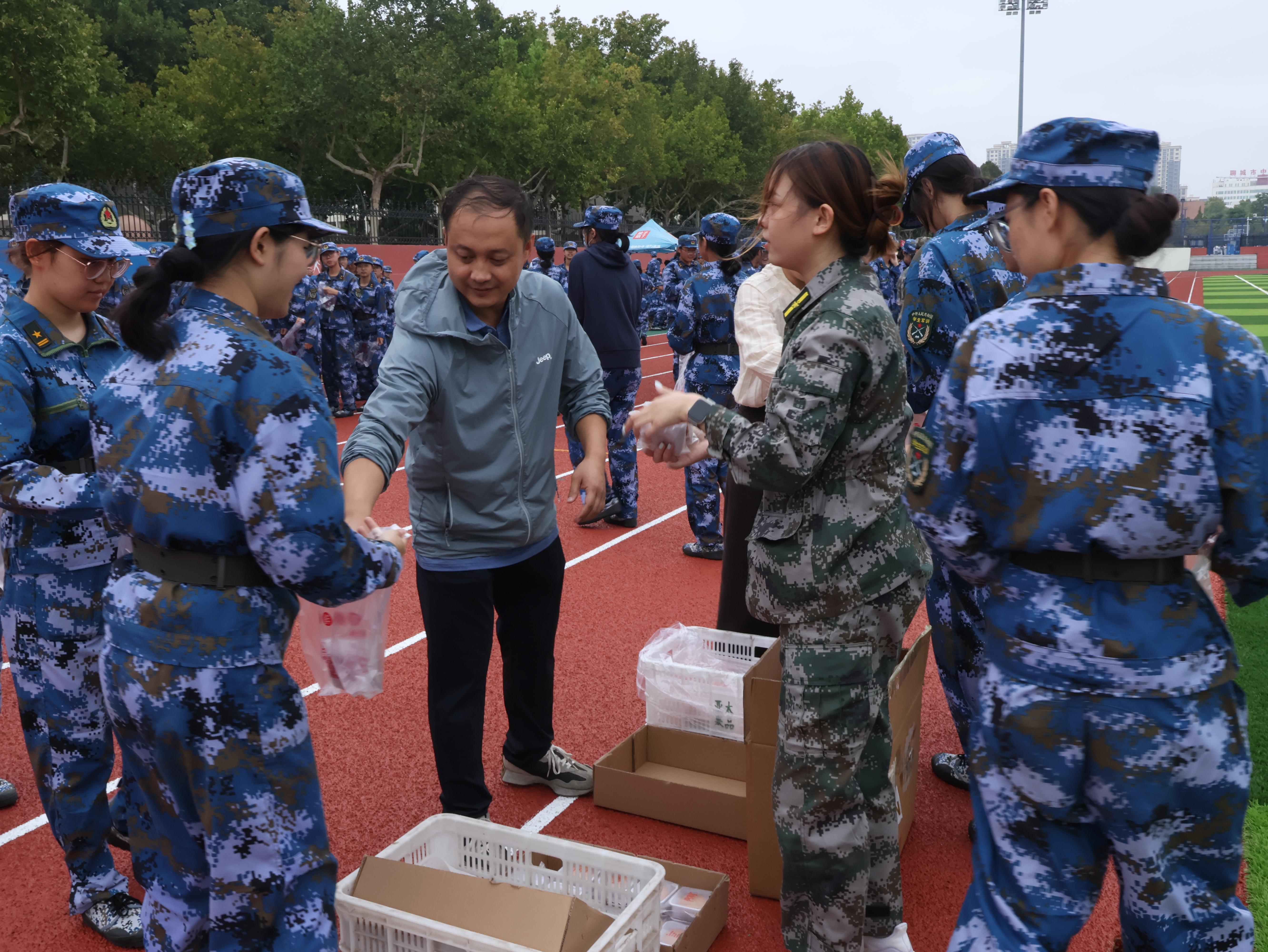 明月映秋思,中秋共此时。为向军训中的新生传递学院的深切关怀与节日的温暖,激发新生军训的活力,9月14日,304am永利集团开展“月满中秋,情满军训”中秋送暖活动。公司党委书记王洪月老师,党委副书记、副经理张超老师,副经理李燕飞老师,团委书记孙哲老师,以及辅导员们来到训练场地,为2024级新生送上了中秋祝福。