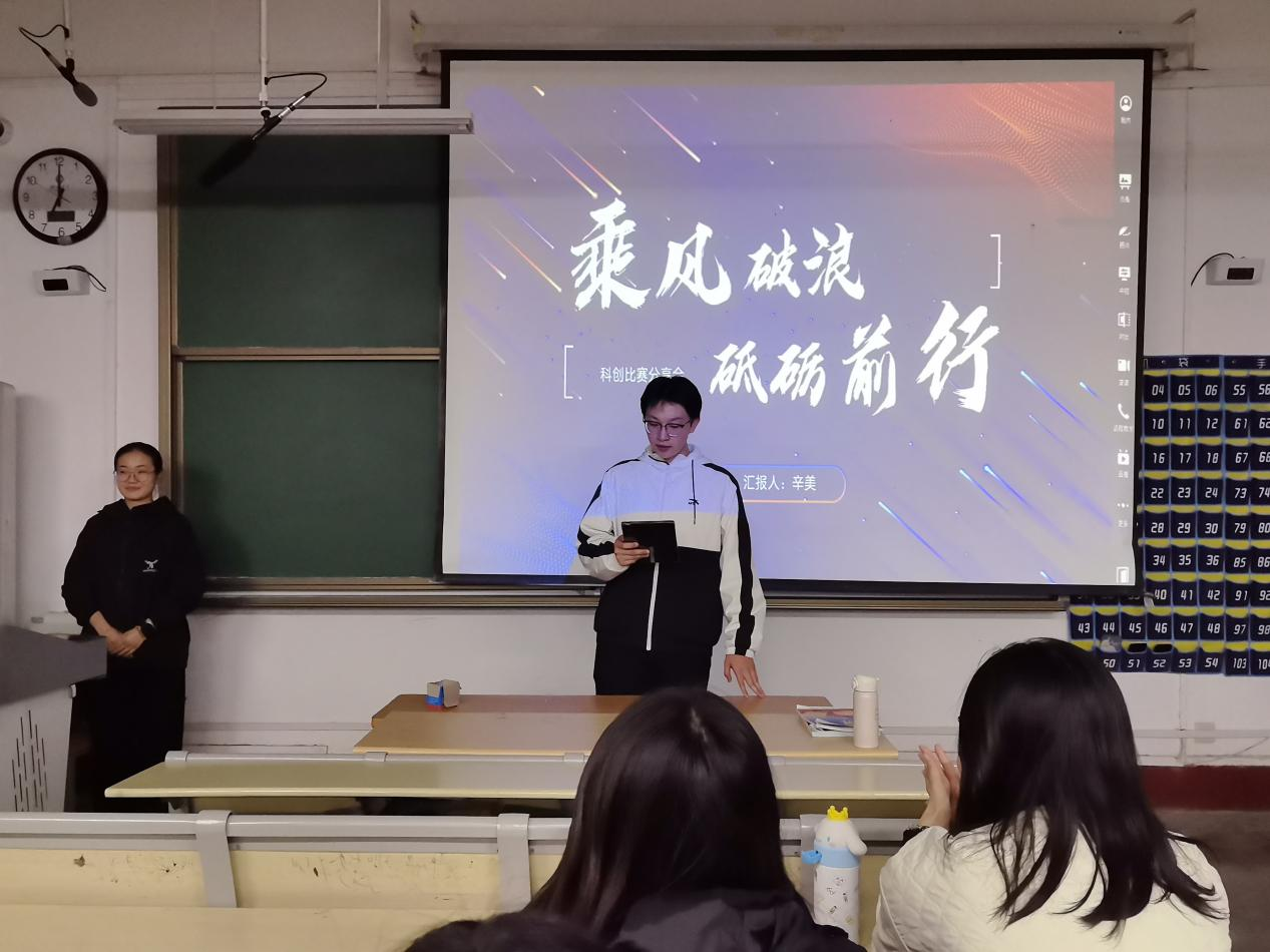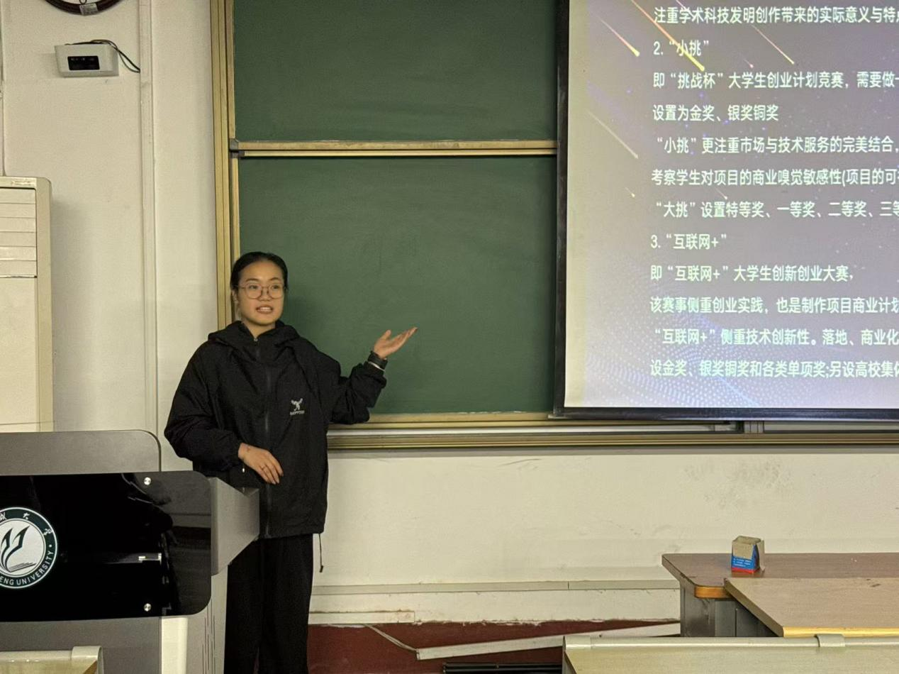 青春逐光,科创领航。活动伊始,辛美以相关视频和图片为载体简要介绍了其所在团队的项目情况及所获奖项,并对“大挑”“小挑”与“互联网+”三个赛事做了详细说明。随后,辛美在比赛经验、所遇挑战及解决方案、团队合作心得、重点注意事项等方面进行了仔细讲解。